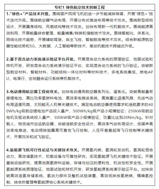 1.强化绿色航空关键核心技术攻关。持续推动总体、气动、结构、发动机、机载、材料、制造工艺等领域技术升级换代,加速发展混合动力推进系统,不断提升干支线飞机、通用航空器节能减排降噪水平。加快发展高能量密度、高放电效率、高安全性的航空动力电池技术,以及高可靠性、高功重比、高效率的航空电推进技术。加强高效燃气涡轮-电能融合技术研究。引导优势企业和研究机构持续突破智能化、高可靠性、轻量化、低成本能量控制和飞行控制技术,开展新能源飞机总体设计、能源系统设计、全电机载系统等技术攻关。持续探索氢燃料存储技术、氢燃料电池技术、氢内燃、氢涡轮发动机技术、氢涡轮混合电推进技术、能量综合管理技术等氢能源飞机关键技术。面向国家绿色航空发展的战略需要,加快布局基础研究和应用基础研究,解决制约绿色航空发展的源头和底层技术问题。