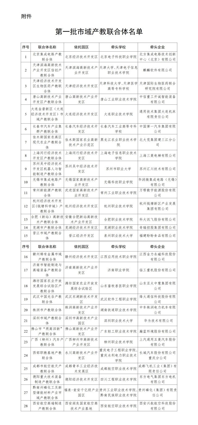 央视网消息:据教育部网站消息,根据《教育部办公厅关于开展市域产教联合体建设的通知》(教职成厅函〔2023〕15号),经园区申报、省级推荐、专家评审、网上公示,确定了第一批市域产教联合体名单,现予以公布。