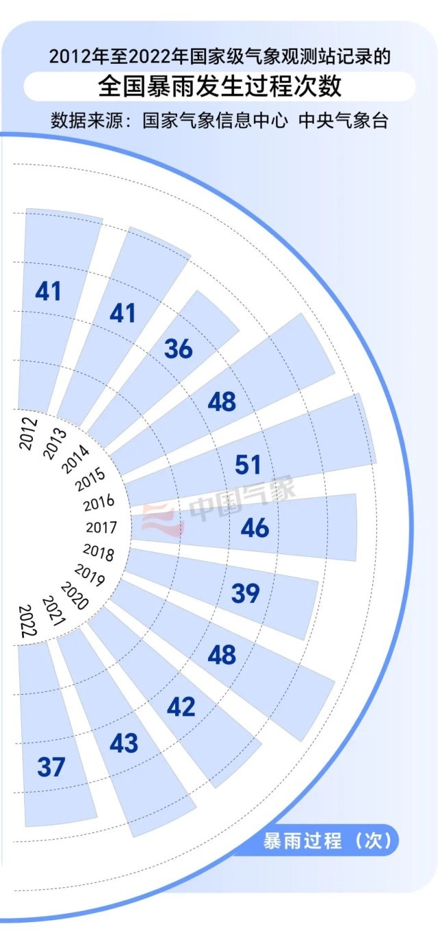 我们通过数据了解下我国近年来的暴雨发生频次。2012年至2022年间,我国共发生暴雨天气过程472次,年均发生次数约为42.9次;2016年暴雨发生次数最多,为51次;2014年最少,为36次(2023年未结束,暂不计)。