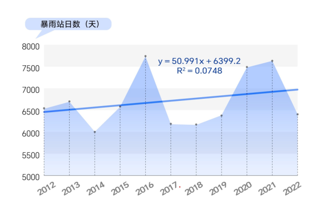 数据统计显示,2012年至2022年,我国暴雨站日数有明显的增加趋势。这意味着,2012年到2022年,我国暴雨天气过程的持续时间或影响范围有增加(扩大)的趋势。