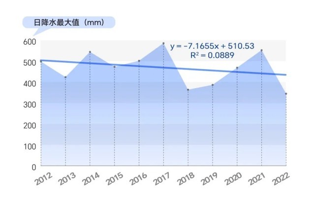 2012年至2022年国家级气象观测站记录的最大单日降水量变化趋势(单位:毫米)