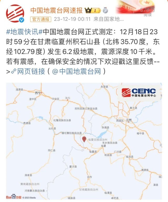 12月18日23时59分,甘肃临夏州积石山县发生6.2级地震,震源深度10公里,距离最近高铁线路近60公里,甘肃多地震感明显。