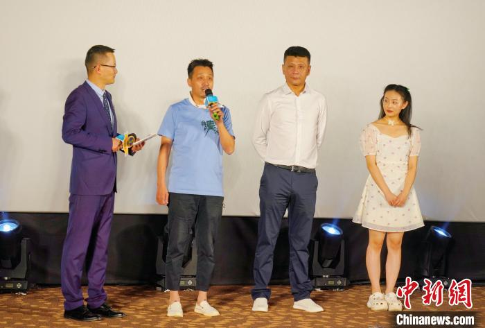图为导演及男女主角接受采访。 祁增蓓 摄