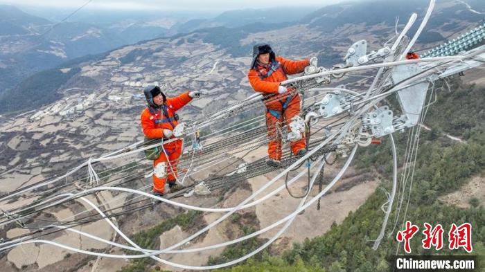 电力工人曾坤银和熊志伟正在进行高空作业。 卢忠东 摄