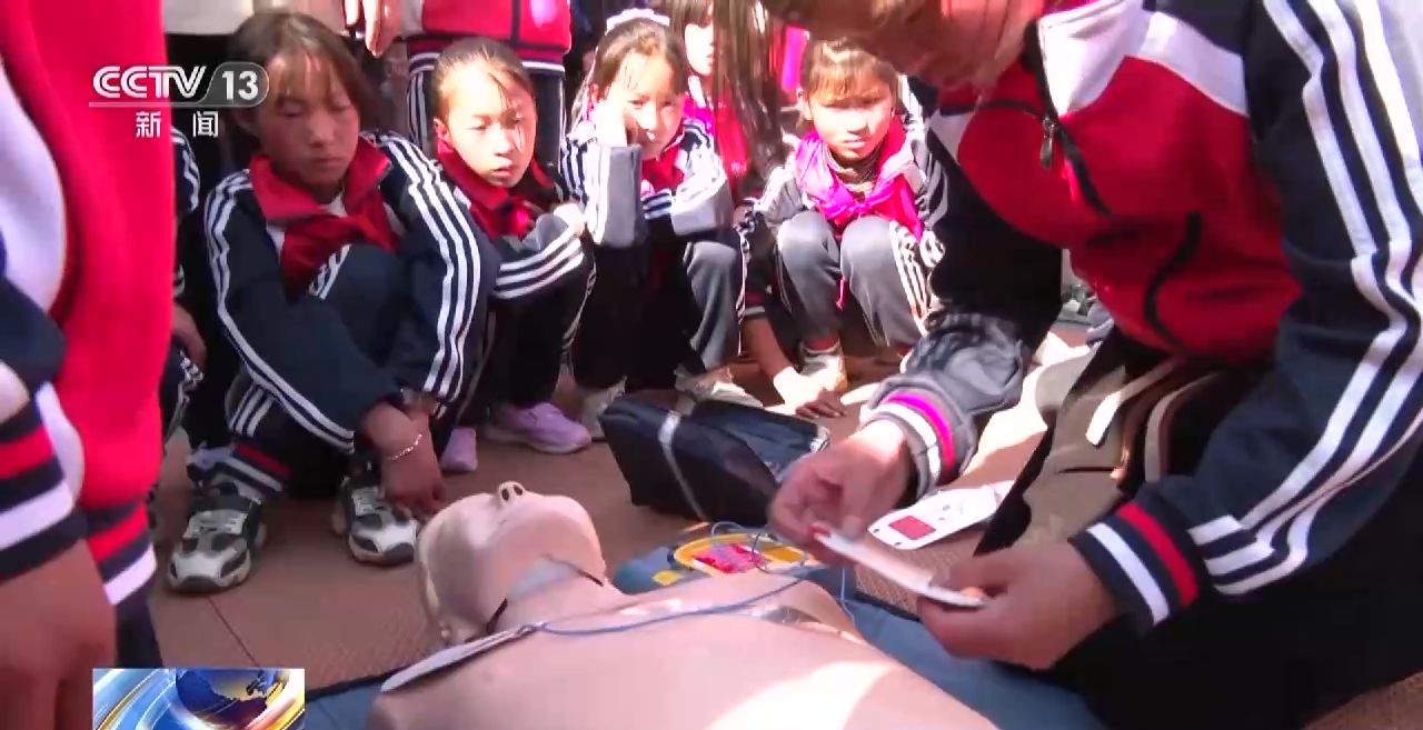 在云南省昭通市鲁甸县鹊落小学,一场“红气球校园挑战赛”将趣味运动会和急救知识答题与实际操作相结合。操场上,同学们在紧张有趣的比赛中不仅得到了运动锻炼,还在红十字会专业救护人员的指导下,体验海姆立克急救法、心肺复苏以及AED(自动体外除颤仪)的使用方法,学习创伤包扎等急救知识和技能。
