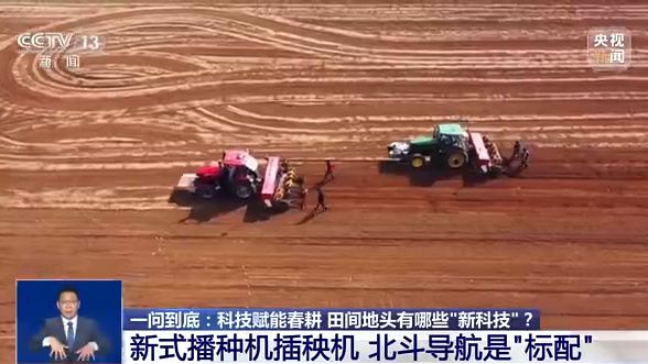 我们先去新疆看看——自带北斗导航的播种机。在新疆昌吉玛纳斯县六户地镇的千亩春小麦种植基地,装有北斗导航系统的大马力拖拉机,带着改良后的新式播种机,正在进行春小麦播种。这种播种机可按照预先设定的线路进行精量播种,而且覆土、铺设滴灌带也同步完成,不仅实现了全程机械化,还提高了作业精度和效率,每天可比传统播种机多播50亩地左右。