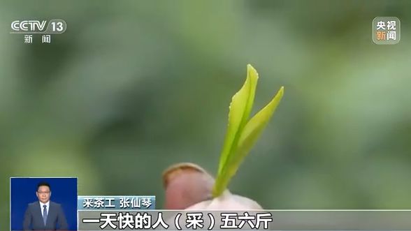 采茶工 张仙琴:我采茶差不多有二十七八年了,这个嫩芽(采摘)我们手工采的话,一天快的人(采)五六斤,慢的人(采)两斤多。