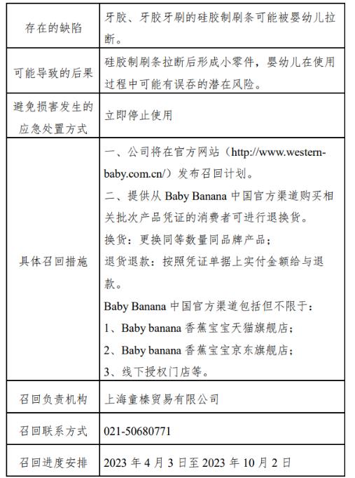 中新网4月3日电 据“上海市场监管”微信公众号3日消息,上海童榛贸易有限公司自2023年4月3日至2023年10月2日召回2010年1月至2022年8月生产的香蕉宝宝牌硅胶婴儿牙胶、玉米硅胶婴儿牙胶牙刷,共计983897件。