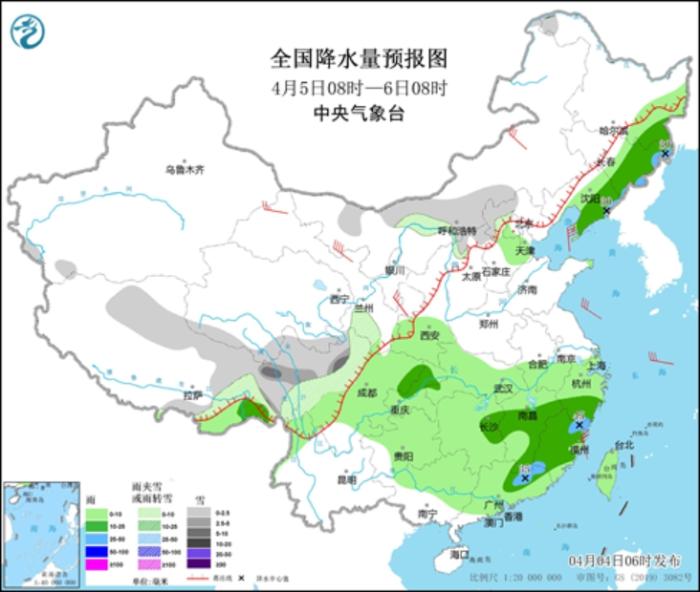 图3 全国降水量预报图(4月4日08时-5日08时)