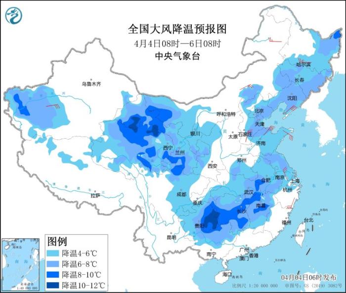 图2 全国大风降温预报图(4月4日08时至6日08时)
