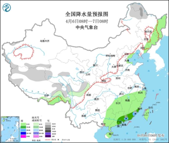 4月6日08时至7日08时,内蒙古东北部、黑龙江西北部、新疆南疆盆地和南疆西部山区、西藏北部和东部、青海南部、川西高原北部等地部分地区有小雪或雨夹雪,局地有中雪。东北地区东部、西藏东南部、河北东北部、天津东部、江南中东部、华南大部、台湾岛等地部分地区有小到中雨,其中,福建东南部、广东东南部等地局地有大雨(25~45毫米)。内蒙古东北部和中部、吉林中部等地部分地区有4~6级风(见图5)。渤海、渤海海峡、黄海北部海域将有6~7级、阵风8级的偏北风。