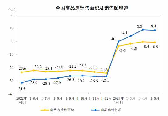 1—5月份,商品房销售面积46440万平方米,同比下降0.9%,其中住宅销售面积增长2.3%。商品房销售额49787亿元,增长8.4%,其中住宅销售额增长11.9%。