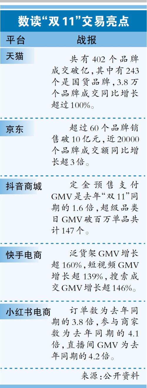 淘天数据显示,今年天猫“双11”用户规模和商家规模显著增长,其中全周期累计访问用户数超8亿,达到历史峰值。截至11月11日零点,共有402个品牌成交破亿,3.8万个品牌成交同比增长超过100%。“官方立减”商品订单量超2.1亿,“天天低价”商品订单量近9000万。京东方面则称,截至11月11日23:59,成交额、订单量、用户数齐创新高,“9块9包邮”“京东百亿补贴”“京东秒杀”成为“增量场”,累计超过60个品牌销售破10亿元,近20000个品牌成交额同比增长超3倍,新商家成交单量环比增长超5倍。
