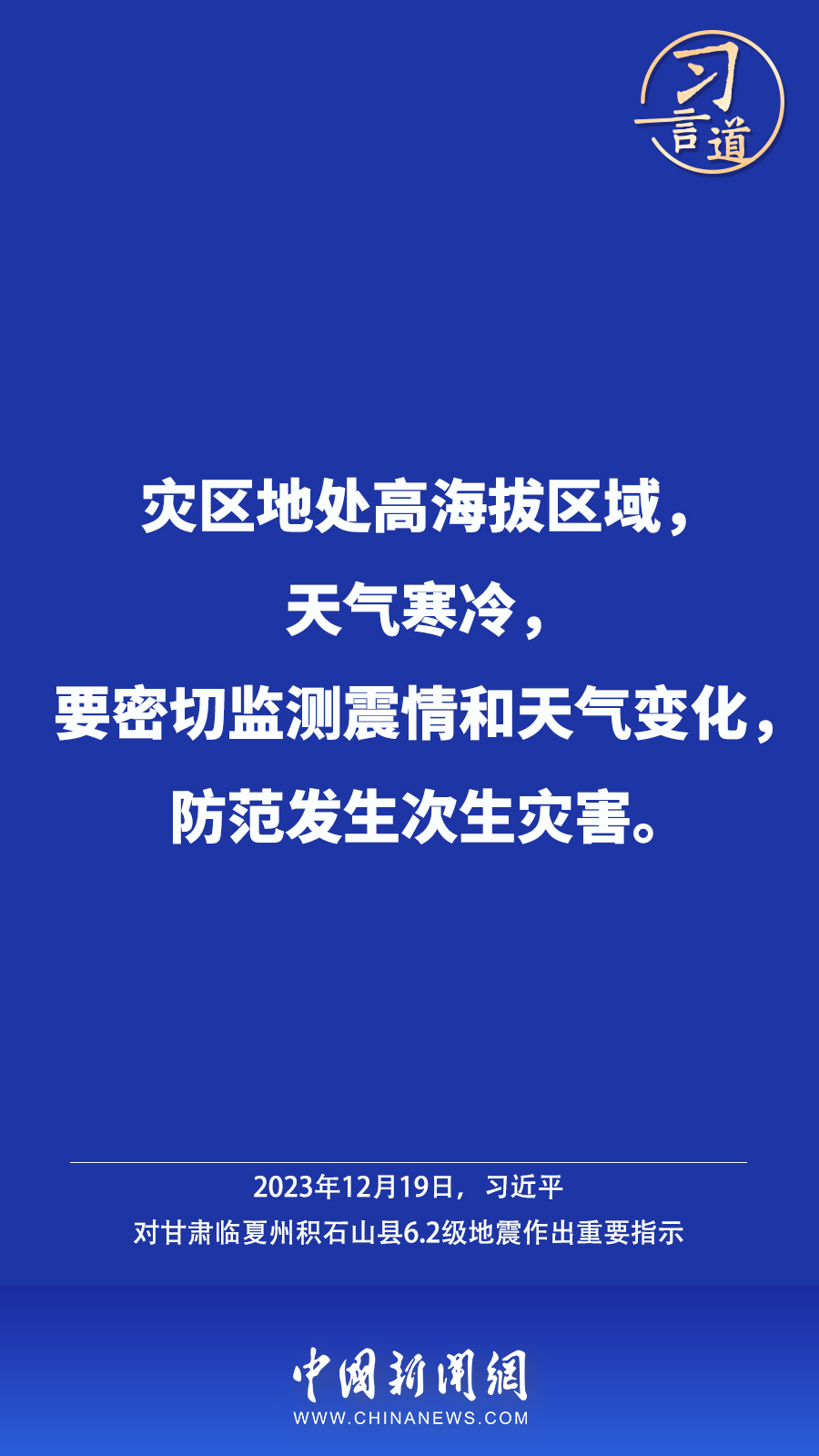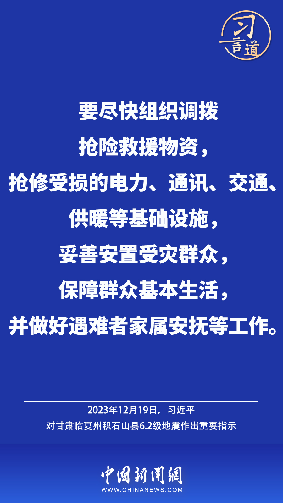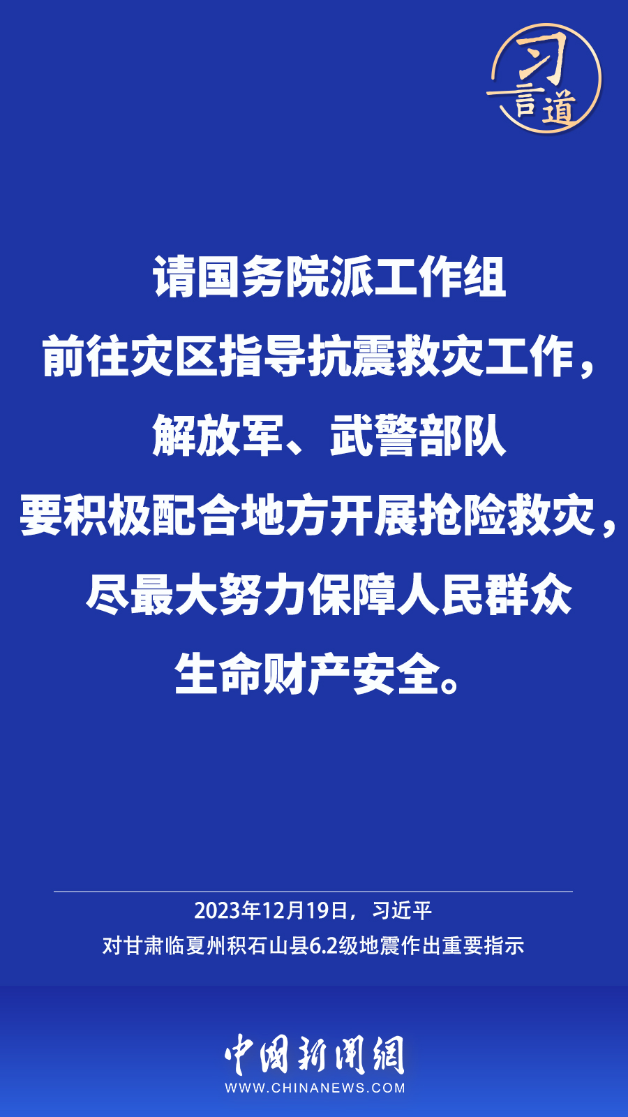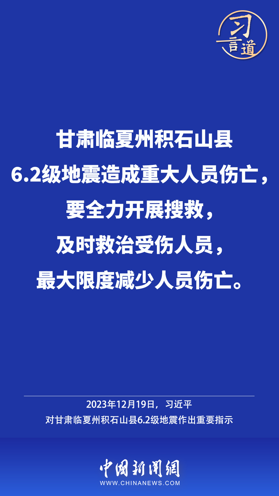 北京时间12月18日23时59分,甘肃临夏州积石山县发生6.2级地震,震源深度10公里。地震发生后,中共中央总书记、国家主席、中央军委主席习近平高度重视并作出重要指示——