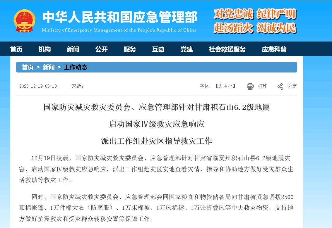 中新网12月19日电 据应急管理部网站消息,12月19日凌晨,国家防灾减灾救灾委员会、应急管理部针对甘肃省临夏州积石山县6.2级地震灾害,启动国家Ⅳ级救灾应急响应,派出工作组赴灾区实地查看灾情,指导和协助地方做好受灾群众生活救助等救灾工作。