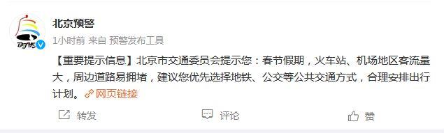 中新网2月5日电 据北京市突发事件预警信息发布中心官方微博消息,北京市交通委员会提示:春节假期,火车站、机场地区客流量大,周边道路易拥堵,建议优先选择地铁、公交等公共交通方式,合理安排出行计划。