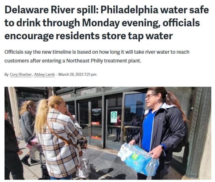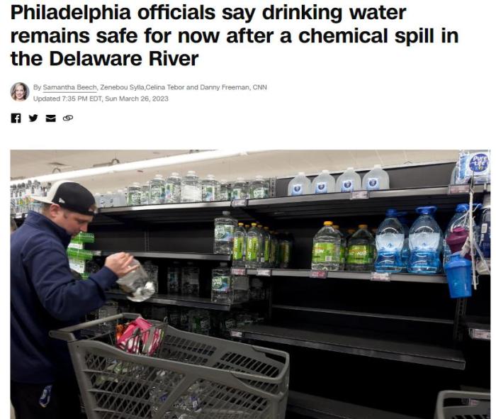 中新网3月27日电 综合外媒报道,近日,美国宾州布里斯托尔一家工厂发生泄漏事故,大量化学物质流入特拉华河一条支流中。事故发生后,费城官员建议当地民众使用瓶装水,引发恐慌性购买。