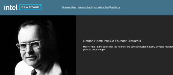 英特尔官网发布的戈登·摩尔去世的消息。图片来源:英特尔官网截图