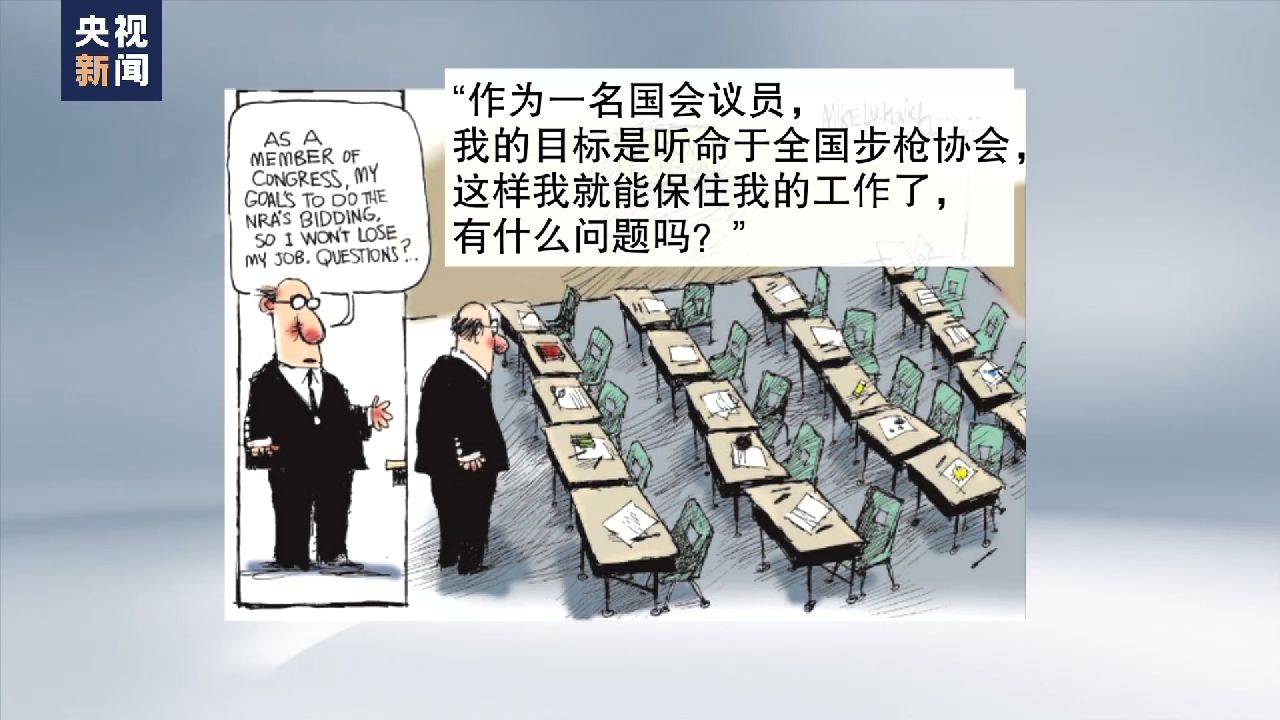 在另一幅漫画中,在一间写有“纽敦市一年级”的教室里,摆放着二十张课桌椅,却唯独不见孩子的踪影。漫画左侧,这名来探视的议员心里想的是,“作为一名国会议员,我的目标是听命于全国步枪协会,这样我就能保住我的工作了,有什么问题吗?”