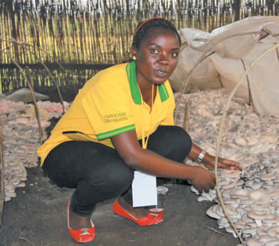卢旺达国立大学的学生姗台在菇棚中采收平菇。