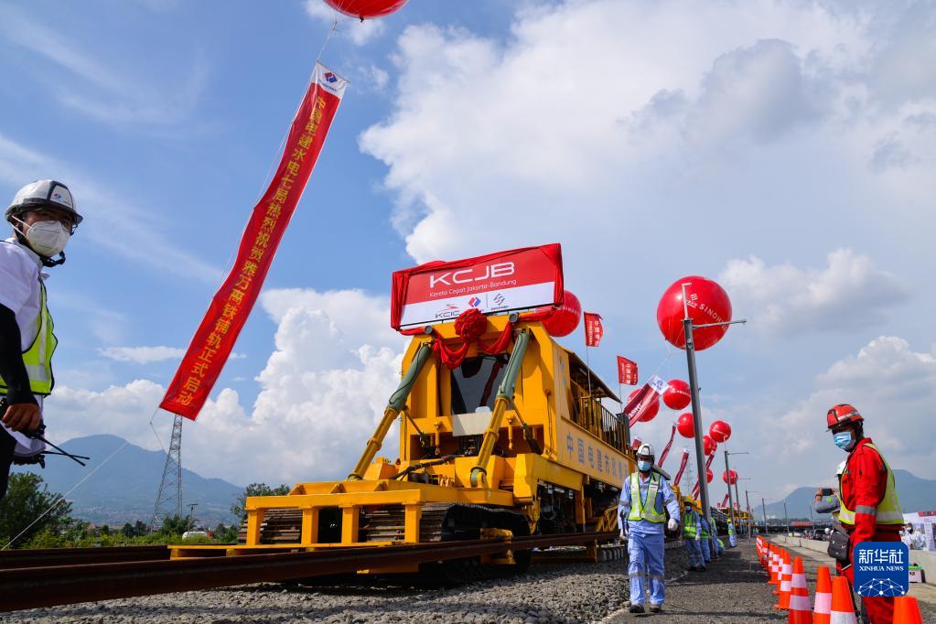 工作人员在印度尼西亚万隆雅万高铁铺轨施工现场作业(2022年4月20日摄)。新华社记者 徐钦 摄