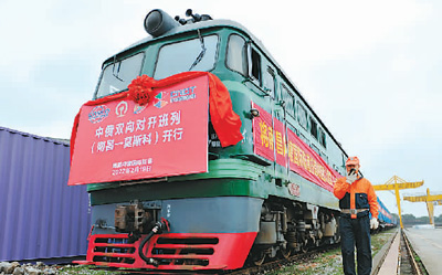图为2022年江西首列中俄双向对开班列(南昌—莫斯科)在南昌向塘国际陆港准备出发。