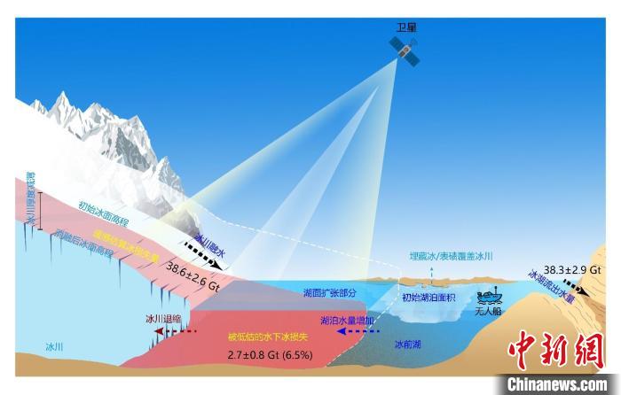 论文第一作者和共同通讯作者张国庆研究员介绍说,数字高程模型(DEM)广泛用于估算全球冰川质量损失,但该方法只能观测到冰川表面和水面,不能揭示发生在冰前湖泊水面以下的冰川质量损失。
