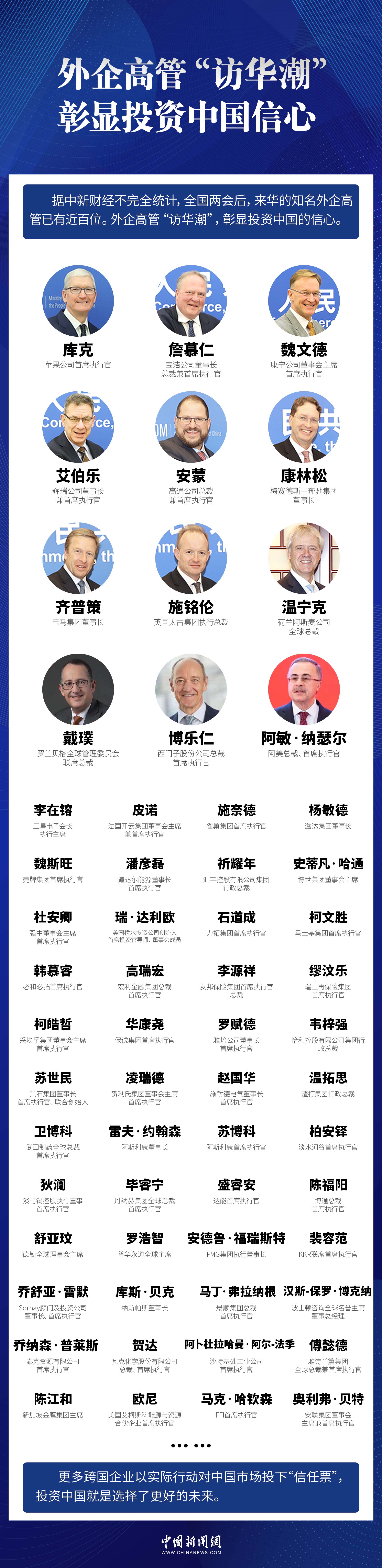 中新网北京4月7日电 (记者 李金磊)时下,外企高管正掀起“访华潮”。据中新财经不完全统计,全国两会后,来华的知名外企高管已有近百位。
