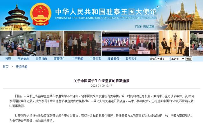 中新网4月9日电 中国驻泰国大使馆9日发布“关于中国留学生在泰遇害的情况通报”,全文如下: