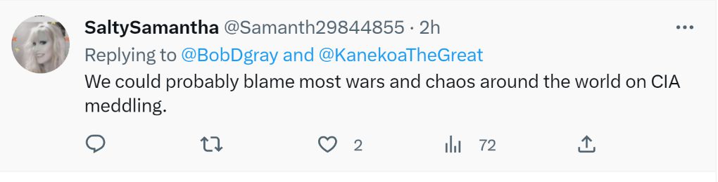 网友“有趣的萨曼莎”说:“世界上绝大多数的战争和混乱都是美国中央情报局带来的吧。”