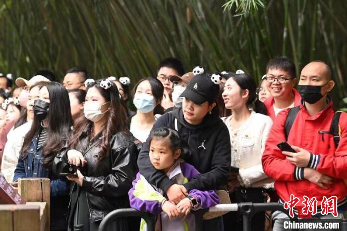 中新网成都4月9日电 (贺劭清 安源 祝欢)4月上旬,成都大熊猫繁育研究基地幼年大熊猫别墅外,抱着竹笋沉浸式“吃播”的大熊猫“和花”吸引了全场游客的目光。人们欢喜地向这位“新晋顶流”挥手问好、拍照留念,似乎全然忘记,为了这三分钟的见面,刚在料峭春寒中排队超过一个小时。