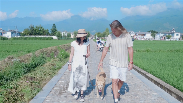 林登和妻子走在云南大理喜洲镇稻田间。受访者供图