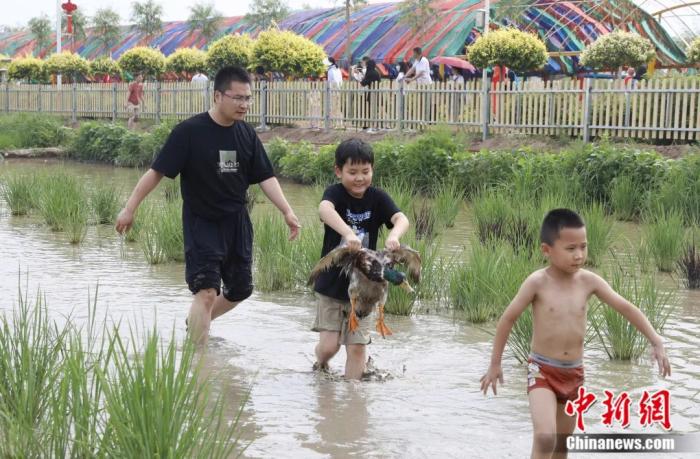 孩子在稻渔空间嬉戏。杨迪 摄