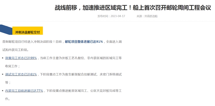 在这之前,3月底,首艘国产大邮轮“誓师保交付”大会举行,外高桥造船公司党委委员、副总经理、大型邮轮总建造师周琦表示,坚决完成首制船年底交付的历史使命。