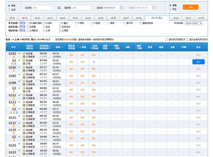 中新财经18日登录12306官网查询发现,4月29日由北京出发到上海、武汉、南京、西安的旅客列车车票已基本售罄,上述线路4月30日车票也所剩无几。