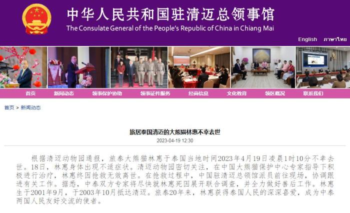 中新网4月19日电 据中国驻清迈总领事馆消息,根据清迈动物园通报,旅泰大熊猫林惠于泰国当地时间2023年4月19日凌晨1时10分不幸去世。
