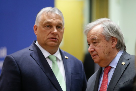 3月23日,在比利时布鲁塞尔的欧盟总部,联合国秘书长古特雷斯(右)与匈牙利总理欧尔班在欧盟峰会开始前交谈。(新华社记者郑焕松摄)