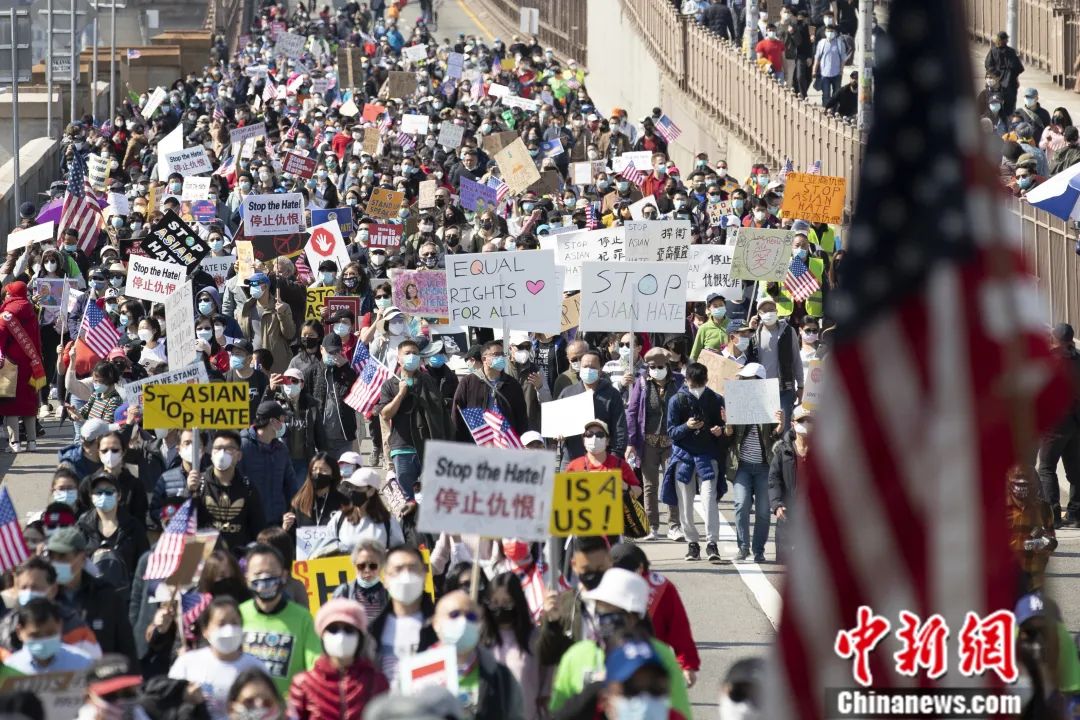 2021年,美国亚裔民众受到种族歧视侵害事件频发,针对亚裔的仇恨犯罪备受社会关注。图为2021年4月,纽约举行反仇恨亚裔大游行。廖攀 摄