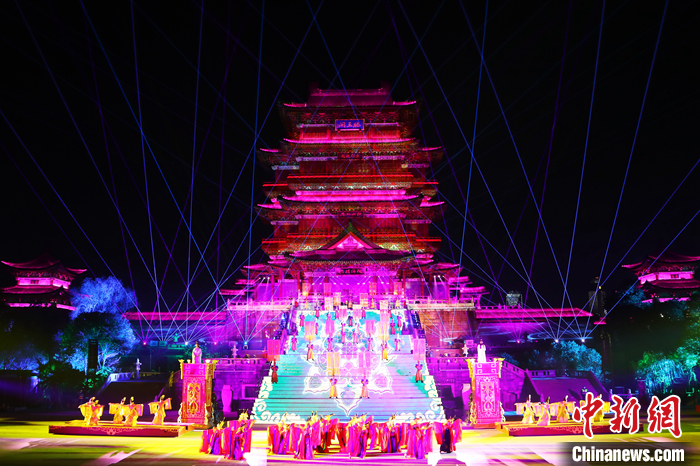 图为2021年1月1日晚,大型实景演出《寻梦滕王阁》在江西南昌滕王阁景区正式公演。 中新社记者 刘占昆 摄