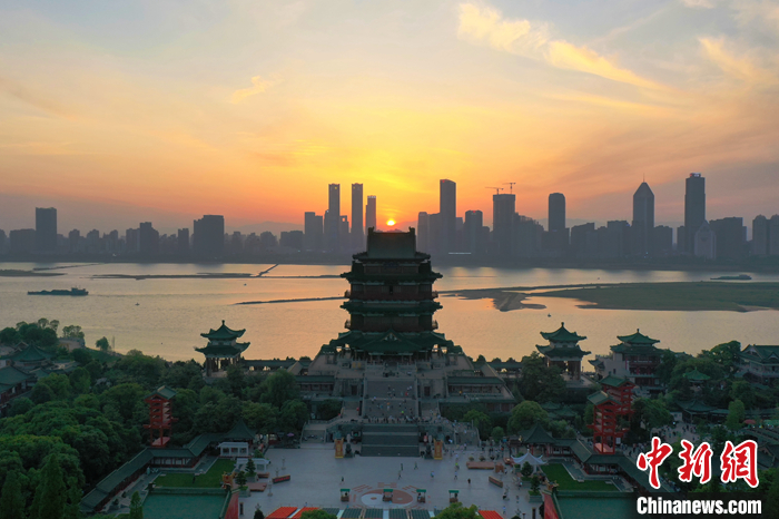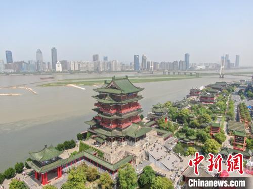图为2021年5月2日, 位于江西南昌赣江之畔的江南名楼滕王阁迎来众多游客。(无人机照片) 中新社记者 刘占昆 摄