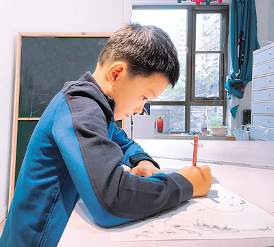 张正昊正在绘制“保护地球大家园”海报。