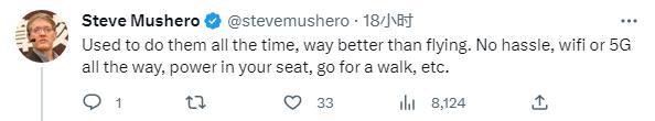 曾在中国工作多年的企业家Steve Mushero也留言说,“我以前一直坐高铁,比坐飞机好多了。不麻烦,一直有wifi或5G,你的座位上有电源,还可以散散步等。”