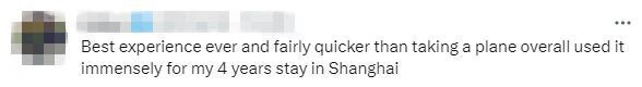 有网友介绍说,“最好的体验,比坐飞机要快得多,我在上海呆了4年,坐过很多次。”