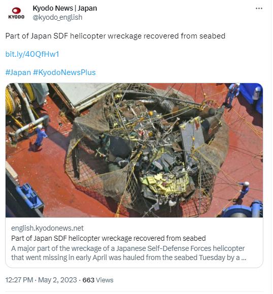 日媒:陆上自卫队失事“黑鹰”直升机主体部分被打捞出水