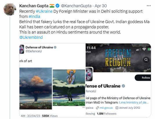 据俄新社报道,印度信息和广播部高级顾问古普塔也对此表达了强烈的不满,他在推特上转发这一截图,并写道,“最近乌克兰副外长曾在新德里请求印度支持。这张伪造图背后隐藏着乌克兰政府的真实面目。印度教女神卡莉被讽刺地画在一张宣传海报上。这是对全世界印度教徒感情的攻击”。