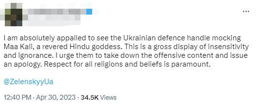 有推特网友@印度外交部和外长苏杰生“请注意这篇诋毁女神卡莉的诽谤帖子。下次乌克兰在联合国寻求帮助和支持时,请记住这一点。”
