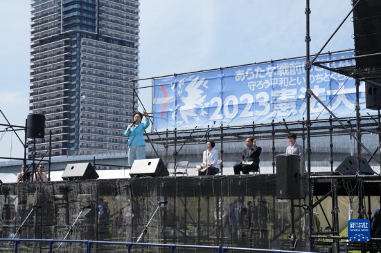 5月3日,在日本东京有明防灾公园的广场上,在野党社民党党首福岛瑞穗在集会上发表演讲。新华社记者 张笑宇 摄