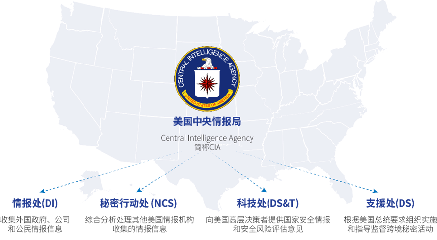 CIA是美国联邦政府主要情报机构之一,总部位于美国弗吉尼亚州兰利,下设情报处(DI)、秘密行动处(NCS)、科技处(DS&T)、支援处(DS)四个部门。其主要业务范围涉及:收集外国政府、公司和公民情报信息;综合分析处理其他美国情报机构收集的情报信息;向美国高层决策者提供国家安全情报和安全风险评估意见;根据美国总统要求组织实施和指导监督跨境秘密活动等。