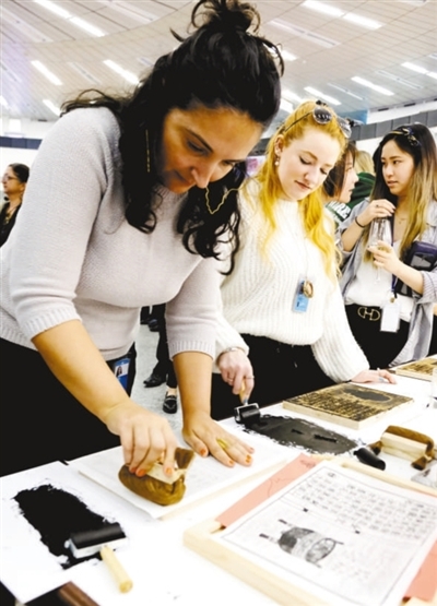 参观者在体验中国传统拓印。