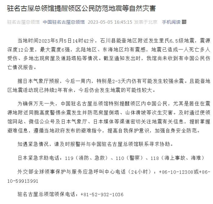 为确保万无一失,中国驻名古屋总领馆特别提醒领区内中国公民,尤其是居住在震源地附近同胞高度警惕余震发生并防范房屋倒塌、山体滑坡等次生灾害。及时通过使领馆网站、微信公众号及日本气象厅、日本媒体等渠道密切关注地震有关信息,提前掌握避难信息,遵循当地政府发布的避难指令,提高自我保护意识,加强自身安全防范。